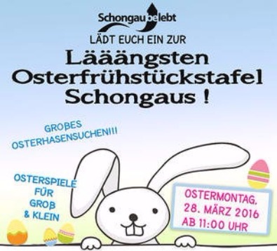 Wir laden wieder alle Schongauer Familien, Omas und Opas, Tanten und Onkel, Freunde - einfach all diejenigen ein, die mit uns zusammen, am Ostermontag, ein Osterfrühstück gestalten und abhalten wollen.