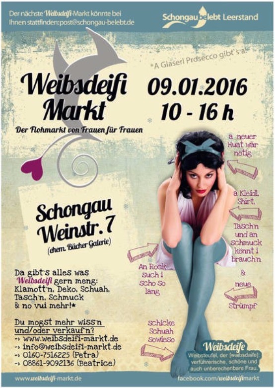 Der Weibsdeifi-Markt findet immer am 1. Samstag eines Monats statt. Nach Möglichkeit in einem leerstehenden Ladengeschäft in Schongau. Beworben wird der Markt über Flyer, Plakate, Banner am Bahngleis, in den Schongauer Nachrichten, Lechkurier, Kreisboten und über den Veranstaltungskalender von Schongau.de